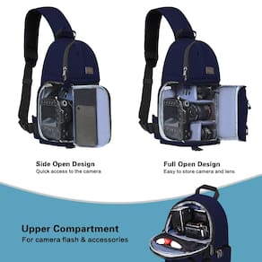 - A camada de espuma macia envolta pode proteger bem sua câmera e acessórios de choques acidentais e arranhões. Separado em 2 partes: a caixa de armazenamento inferior maior (dimensão interna: 25,7 x 20 x 11 cm) é separada com inserções modulares removíveis para caber em várias lentes e unidades de flash; partes superiores para acessórios necessários. O suporte de tripé é apresentado em um lado. 1 bolso oculto com zíper antirroubo na parte de trás para seus itens preciosos.