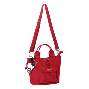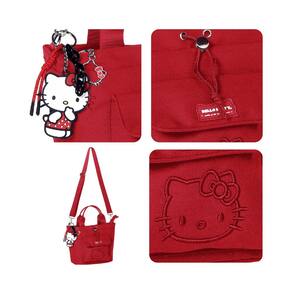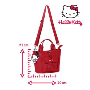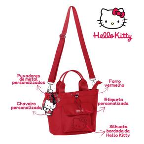 Características Bolsa: - Confeccionada em nylon - Silhueta bordada da Hello Kitty - Puxadores de metal personalizados - Forro vermelho personalizado - Chaveiro personalizado - Etiqueta em patch de PVC silkado