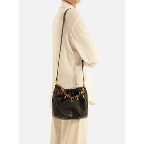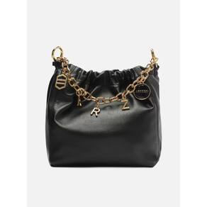 Descrição: Bolsa tiracolo pequena preta de couro. O modelo tem formato arredondado e acabamento macio. Possui alça lateral regulável e fecho superior franzido. Traz corrente metálica, presa à bolsa na parte frontal, com aplicação de pingentes das letras A, R e Z, peça geométrica e colorido do nome da marca.