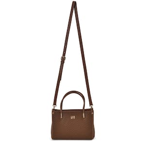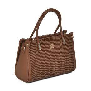 Bolsa Tote Via Marte pequena, confeccionada em material sintético com efeito de matelassê plissado, garantindo um visual elegante e moderno. Possui alça longa ajustável e removível, além de alças de mão fixas para maior versatilidade. O fechamento principal é em zíper, oferecendo segurança e praticidade. O detalhe metálico do logotipo frontal complementa o design sofisticado, sendo ideal para compor produções contemporâneas e funcionais.