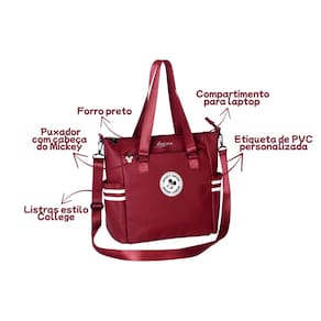 Características Bolsa: - Confeccionada em PVC liso com silhueta prensada - Etiqueta de PVC personalizada - Silk com assinatura do Mickey - Forro preto - Puxador com cabeça do Mickey - Compartimento para laptop - Cabe caderno universitário