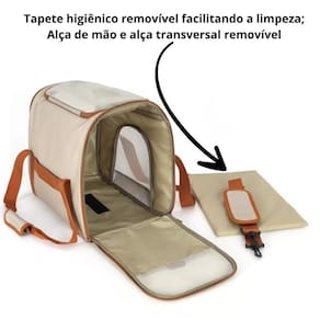 Com design dobrável e funcional, a bolsa conta com duas aberturas com tela para ventilação, almofada interna removível, guia de segurança acoplada e resistência à água, oferecendo comodidade tanto para o tutor quanto para o pet. Pode ser carregada com as alças de mão ou com a alça transversal ajustável e removível.