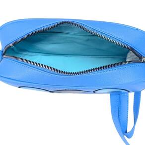 Material Sintético Durável: Fabricada com material sintético couro ecológico de alta qualidade, esta bolsa é resistente ao desgaste diário e fácil de limpar, mantendo sua beleza por muito tempo. Possui puxadores personalizados e forro de tecido azul.