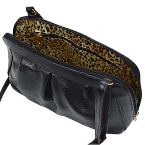 CARACTERÍSTICAS Material Externo : Confeccionada em COURO, de origem bovina com textura lisa e macia. Metais : Todos os metais / ferragens são na cor DOURADA com tratamento de banho antioxidante. Forro : Cetim com texturas em animal print (similar padrão "oncinha") Alça Comprida : Alça fixa não removível medindo 01 cm de largura por 140 cm de comprimento, com regulador de comprimento Parte Externa : Na frente e atrás couro franzido Parte Interna : Possui 1 divisão principal e 1 bolso fechado com zíper para pequenos objetos Fechamento : Com zíper de nylon de fácil deslize Peso : 300 gramas (ela vazia)