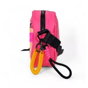 Características: - Confeccionada em nylon com detalhe em material telado - alça acetinada - zíper tratorado - banho de metal preto - puxadores de corda - acompanha chaveiro de cadarços e molinha - forro de poá