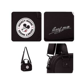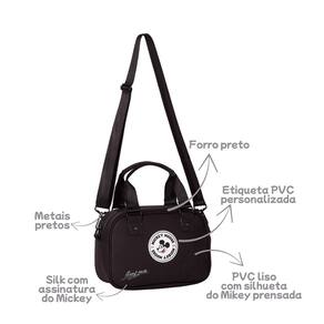 Características: - PVC liso com silhueta prensada - Alça de mão - Alça transversal - Silk com assinatura Mickey - Etiqueta PVC personalizada - Metais pretos - Forro preto - Puxador com cabeça do Mickey