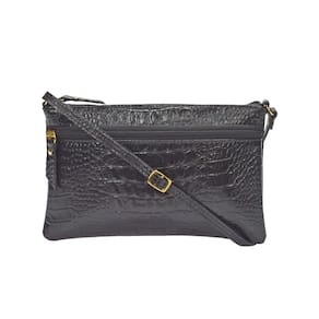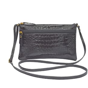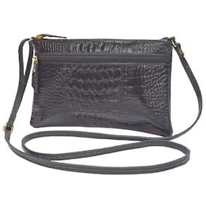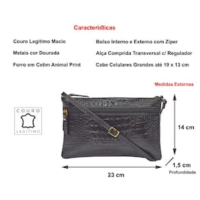 Bolsinha PEQUENA, feminina, transversal em couro, com alça comprida para uso transversal ou tiracolo lateral com regulagem de comprimento da alça. Metais na cor dourada, couro em textura croco. Muito prática para uso no dia a dia. O forro é confeccionado em cetim com texturas variadas tipo 'animal print' (padrão oncinha) ou similar, que valorizam ainda mais o produto. Possui 1 bolsinho interno e 1 bolsinho externo fechado com zíper para organizar pequenos objetos. O fechamento da parte superior principal é em ziper de nylon que proporciona um fácil deslize e segurança aos seus objetos.