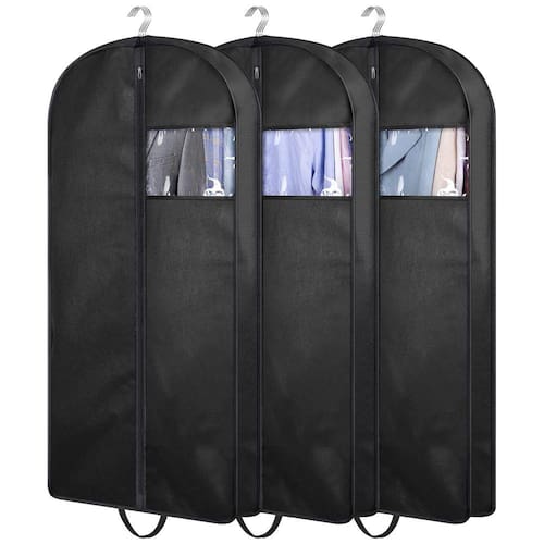 - Capacidade espaçosa: conjunto de 3 sacolas de roupas para armazenamento, cada bolsa de roupas pendurada tem reforços de 4 polegadas para armazenar cerca de 4 ternos ou 8 peças de camisas. 3 pacotes podem conter até 12 peças de jaquetas ou 9 peças de casaco de inverno;