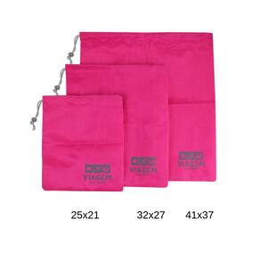 O kit organizador de três peças é o produto perfeito para aqueles que gostam de deixar tudo organizado em suas viagens. com seus largos compartimentos e fecho em cordão, eles possibilitam armazenar diversos produtos, sem perder a organização e o charme. praticidade para ir ao clube, academia, viagens e muito mais o kit inclui 3 bolsos nos tamanhos: p 25x21 m 32x27 g 41x37 material: poliéster marca: jacki design cor: pink 3 unidades