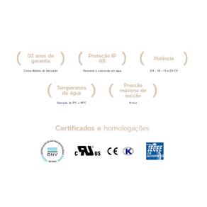 Bomba alta vazão 2 cv 220v super syllent Bomba alta vazão 2 cv 220v super syllent Bomba alta vazão 2 cv 220v super syllent, é indicada para banheiras duplas e spas que possuem uma quantidade maior de jatos. Características técnicas - potência: 2 cv 1.500w ; - tensão: 220v; - corrente: 6,5 a; - vazão máxima: 26,8 m/h para 2 mca; - vazão mínima: 6,5 m/h para 14 mca; - sucção entrada : 50 mm soldável ; - recalque saída : 40 mm soldável ; - temperatura da água: 5ºc a 45ºc. Benefícios - super silenciosa: adiciona menos de 5db ao ruído ambiente; - resistente à submersão em água proteção ip68 ; - proteção térmica: desliga a bomba em caso de sobreaquecimento; - sensor de escorvamento: é fornecida com dispositivo eletrônico de segurança, o qual desliga automaticamente após 12 segundos; - autodrenante: evita o acúmulo de água na bomba e na tubulação. Disponibilizamos a retirada do produto em nossa loja física, ao fazer o seu pedido escolha a opção e venha nos visitar. Estamos localizados no centro da cidade de . Caso prefira, pode receber o produto em endereço de sua escolha, selecionando a opção de mais adequada à sua necessidade. Dimensões do produto - peso: 8,3 kg; - comprimento: 36,8 cm; - largura: 15,1 cm; - altura: 20,4 cm. Marca: Não Informado Ean: 7732548401775