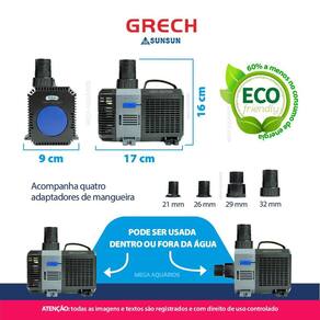 As bombas da linha Grech Eco CTP de alta vazão para aquários e lagos são anfíbias, ou seja, podem ser utilizadas dentro ou fora da água e possuem tecnologia exclusiva que chega a consumir cerca de 60% a menos de energia elétrica.