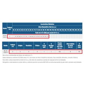 Especificações Técnicas: Modelo: ME-IN 1530N - Mancalizada Potência indicada: 3 cv Estágios: 5 Diâmetro Sucção: 1 Polegada Diâmetro Recalque: 1 Polegada Pressão máxima sem vazão: 102 m.c.a Altura máxima de sucção: 8 m.c.a Rotor: 110 mm Bocais com rosca BSP Rotor fechado de aço inox AISI-304 Anel flutuante de aço inox AISI-304 Eixo de aço inox VC150 Selo mecânico constituído de aço inox AISI-304, EPDM, grafite e cerâmica (até 3 cv) Lateral de entrada, divisão, corpo de saída, acoplamento e intermediário de ferro fundido Motor elétrico IP-21, 2 polos, 60 Hz (até 3 cv)