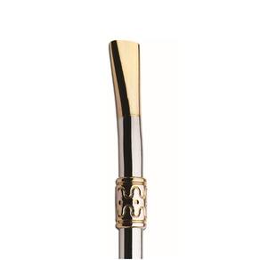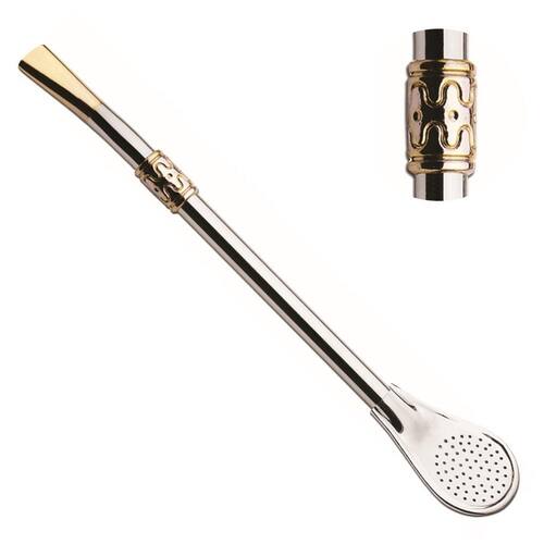 Bomba para chimarrão em aço niquelado com banho de cromo, sem biqueira, com bojo em formato pêra, e com um delicado anel dourado no centro do cano