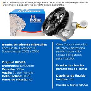 Bomba Da Direção Hidráulica Ford Fiesta Eco Sport 1.0 Supercharger - Indisa Dh206118 Bomba de Direção Hidráulica Ford Fiesta e EcoSport SuperCharger 2002 a 2006 - Indisa Polia inclusa: 04PK Pressão: 90 Bar Vazão: 7L por minuto Furos de Fixação: 02 Orientações: É recomendada a instalação em oficinas autorizadas e especializadas. A instalação incorreta da peça torna o produto excluso da . Obs: Alguns veículos utilizam 3 parafusos, sendo 1 guia, não sendo obrigatório para fixação. Bomba de Direção parafusada ao Cárter. Cuidados Instalação : A. Antes de instalar a bomba, remova e limpe o elemento filtrante do reservatório de fluido da direção hidráulica. Caso não seja possível, devido ao difícil acesso, substitua o reservatório; B. Utilize ferramentas adequadas para remover ou instalar a polia, pois desta maneira, se evitará que a mesma ou o eixo se danifiquem, comprometendo o funcionamento da bomba; C. Ao instalar a bomba, substitua o anel de vedação da mangueira , garantindo a correta vedação do sistema; D. Substitua todo o fluido, realize a devida limpeza e elimine todo o ar do sistema; E. Com o motor do veículo desligado e a mangueira de retorno do reservatório desconectada, gire o volante de batente a a batente por diversas vezes. Mantenha sempre o nível de fluido no reservatório; F. Repita o procedimento até que o fluido saia na mangueira de retorno do reservatório completamente limpo; G. O ideal é usar cerca de 2 litros de fluido durante a limpeza e sangria do sistema para garantir sua eficácia; H. Reconecte a mangueira ao reservatório e repita o procedimento ate alinhar o nível de fluido do reservatório. Sempre verifique o nível com a direção centralizada; I. Utilize apenas o fluido recomendado pelo fabricante do veiculo consultar manual do proprietário ; J. Recomenda-se a revisão preventiva no sistema a cada 30.000 km ou 1 ano. A má instalação ou mau uso do produto, implicará na perda da . Modelos Compatíveis: Ford Fiesta - 1.0 SuperCharger - 2002 a 2006 Ford EcoSport - 1.0 SuperCharger- 2002 a 2006 19838 DHB 2S65-3A696-CA FORD 96118 AMPRI Características: Marca: Indisa Referência: DH206118 Linha: Bomba de Direção Hidráulica : 6 Meses de Fábrica Material: Ferro Fundido Quantidade: 1 peça Imagens Ilustrativas. Marca: Não Informado