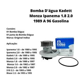 A Bomba D'Água Indisa é a peça essencial para o sistema de arrefecimento dos veículos Kadett, Monza e Ipanema com motor 1.8 e 2.0 gasolina, fabricados entre 1989 e 1996. Projetada para garantir a circulação eficiente do líquido refrigerante, ela mantém a temperatura ideal do motor, prevenindo superaquecimento e aumentando a vida útil do conjunto mecânico. Produzida com materiais de alta durabilidade, a bomba apresenta alta resistência à corrosão e desgaste, suportando longos períodos de uso contínuo sem perda de desempenho. Seu mecanismo interno é fabricado com precisão para assegurar um encaixe perfeito e funcionamento silencioso, mantendo a pressão adequada do sistema de arrefecimento. A Indisa, referência em componentes automotivos, assegura que este produto passe por rigorosos testes de qualidade, garantindo máxima eficiência e confiabilidade para seu veículo. Aplicação: