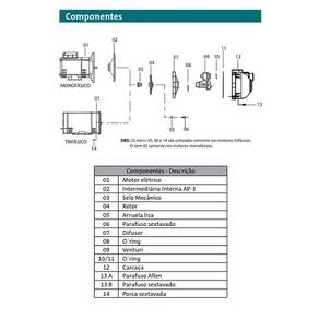 - Rotor – Injetados em termoplástico de engenharia, Noryl reforçado com fibra de vidro, cujas características asseguram excelente desempenho. O rotor é do tipo fechado.