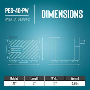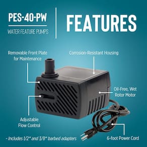 - ESPECIFICAÇÕES: 120 volts; 0,03 amperes; 2,5 watts; cabo de 6 pés; adaptadores farpados de 3/8 polegadas e 1/2 polegadas incluídos; 45 GPH com elevação de 1 pé; fechamento de 2,1 pés; altura máxima da fonte 16,8 polegadas ou menos