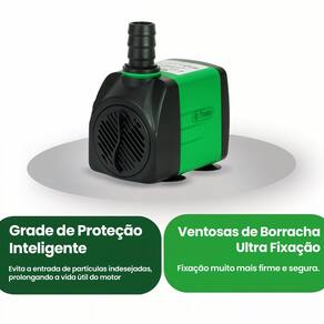 A estrutura da bomba conta com proteção IPX8, o que garante funcionamento submerso seguro em até 1,5 metro de profundidade por períodos prolongados. Sua altura máxima de elevação de 2,2 metros permite uso em instalações verticais ou com desníveis. A grade de proteção inteligente impede a entrada de partículas maiores, protegendo o motor e aumentando sua durabilidade, enquanto as ventosas de ultra fixação asseguram estabilidade e segurança na instalação.