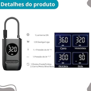 Características: Portátil e compacto, ideal para transporte no carro ou em casa. Tecnologia digital com display de fácil leitura para ajuste preciso da pressão. Versatilidade para inflar pneus de veículos, bicicletas, bolas esportivas, entre outros. Desligamento automático ao atingir a pressão desejada para segurança durante o uso. Fácil uso com detecção automática de psi e modos pré-definidos.
