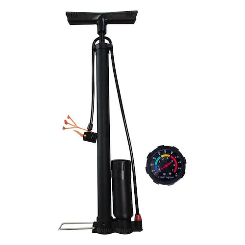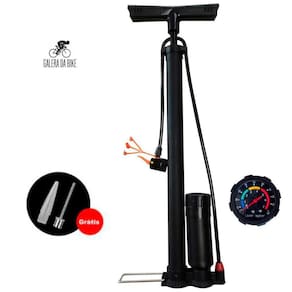 Suporta até 100 psi/bar material em alumínio resistente mangueira em material emborrachado maleável e resistente embolo leve ergonomico e ajustavel as mãos possui acessórios (ponta para encher bola e ponta para encher piscina infantil, colchão inflável etc) altura 65 cm Bomba com manômetro e na cor preta