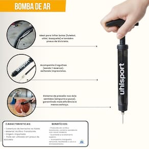 · Ideal para inflar bolas · Pode ser utilizada em pneus de bicicleta · Pressão nos dois sentidos · Acompanha mangueira removível · Contém 2 agulhas (1 extra na haste) · Cobertura de borracha na haste · Material: Acrílico Translúcido · Mecanismo: Manual · Tipo de bico: Fino · Origem: Importada · Embalagem: Individual