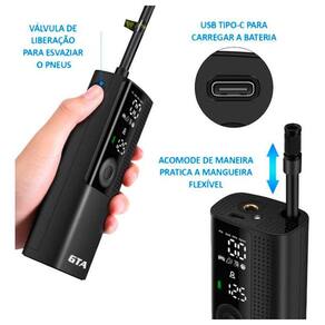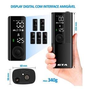 Características: Bivolt, Bomba portátil, Display digital Marca: GTA Cor: Preto Com led de serviço Salva pré-definições Desligamento automático Bateria de li-ion de longa duração, com capacidade de 2000mah Recarregável via usb Pressão máxima de trabalho: 120psi Peso: 390g