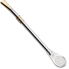 Desfrute seu chimarrão com qualidade, sabor e tradição! #Peça Inteira #Bojo Pêra #19cm Garantia: 90 dias / Peso: 030g/ Cor: Prata e Dourado/ Ref: 111 Dimensões: 2cm(C) x 1cm(L) x 19cm(A) Cuidados: Não lavar com materiais abrasivos. Após o uso lavar com esponja macia e sabão neutro, guardar o produto seco. Bomba: Sem Rosca. Material: - Ferro: Material de alta durabilidade, com excelente camada de protetivo, não perde suas propriedades. Bomba de qualidade medindo 19cm de altura, fabricada em ferro, possui bocal dourado, dando aquela nobreza na bomba. Cano com anel trabalhado em dourado vai compor perfeitamente com sua cuia. Bojo em formato de pera é indicada para mate, mas pode ser usada para Tereré e Chimarrão.
