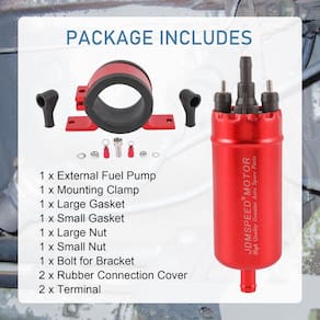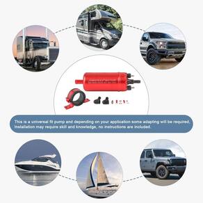 Números de peça de substituição desta bomba: 0580453911, 0580463017, 0580464023 0580463011, 0580464013, 0580464033 0580463012, 0580464014, 0580464038 0580463013, 0580464015, 0580464048 0580463014, 0580464016, 0580464050 0580463015, 0580464019, 0580464051 0580463016, 0580464020, 0580464055 0580464056, 0580464070, 0580810046 Esta é uma bomba de ajuste universal e, dependendo da sua aplicação, será necessária alguma adaptação. A instalação pode exigir habilidade e conhecimento, nenhuma instrução está incluída - A bomba de combustível externa é feita de latão de alta densidade e liga de aço, com alta dureza, não é fácil de usar, não é fácil de corroer e tem uma longa vida útil - O pacote inclui: 1 x bomba de combustível externa, 1 x braçadeira de montagem, 2 x tampa de conexão de borracha, 2 x terminais, 1 x junta grande, 1 x junta pequena, 1 x porca grande, 1 x porca pequena, 1 x parafuso para suporte; cor: vermelho - Esta é uma bomba de ajuste universal e, dependendo da sua aplicação, será necessária alguma adaptação. A instalação pode exigir habilidade e conhecimento, nenhuma instrução está incluída - Suporta aplicação de alta potência: 300-800 H, vem com um calibre de 45 mm e porta de calibre NPT de 1/8 polegadas, ajustável de 0 a 100 psi para a capacidade máxima da bomba de combustível - Dados técnicos: Entrada - ½" (12 mm) pushon; Saída – ¼" (8mm) pushon; Taxa de fluxo - 135ltr/h @ 3bar (35 gal/h @ 45 psi); Pressão máxima - 8,5 bar (125 psi)