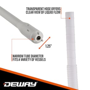 O sifão que gruda por você através de grosso e fino. Chega de se atrapalhar com latas de gás pesado! Deixe a bomba fazer o trabalho pesado com a coleção de bombas de transferência de bastão alimentadas por bateria DeWay. Com quatro bombas recentemente redesenhadas para transferir gasolina, querosene, combustível diesel, líquidos não corrosivos, água não potável, água suja de aquário e muito mais, esta linha potente e portátil oferece opções para operação conveniente com uma mão e completamente sem as mãos. Então, se você está procurando um sifão manual simples para abastecer carros e equipamentos de gramado ou uma bomba de 'definir e esquecer' com detecção automática de transbordamento, há um modelo construído para atender às suas necessidades específicas. Em vez de usar um painel de controle volumoso ou máquina externa para bombear, nosso motor altamente eficiente está alojado dentro de um bastão de sucção fino e estreito, o que significa que o tubo de admissão cabe dentro de quase qualquer lata de gás ou receptáculo similar! Cada bomba vem equipada com uma mangueira de descarga estendida de 129,5 cm (transparente, preta ou de borracha, dependendo do seu modelo), caixa de bateria de fácil acesso com capa protetora, clipe de armazenamento de mangueira sem gotejamento e simples interruptor liga/desliga. A coleção também apresenta quatro opções exclusivas de bicos para acomodar uma ampla variedade de usos, mas todas com a mesma impressionante taxa de transferência de 3,2 galões por minuto para a ação de sifonamento mais rápida e eficiente com baterias. Então, pare de colocar suas costas e corpo em posições perigosas — e fique com os especialistas em bombas portáteis! Adicione uma bomba de transferência a bateria DeWay ao seu carrinho hoje! - Bomba de transferência de combustível portátil movida a bateria | A bomba de transferência de gás permite que você mova todos os tipos de líquidos não corrosivos e não potáveis sem derramamentos bagunçados e trabalho de quebra! O sistema fácil de operar possui uma mangueira de transferência transparente de 129 cm com bocal básico "sem frescuras", tubo de admissão de sucção de 48 cm, interruptor de controle liga/desliga e operação conveniente de bateria [4 AA] para movimentação de gás, querosene, diesel, água suja, etc. - Motor embutido potente funciona em baterias 4AA | Não é necessário levantamento pesado! Desfrute de transferência de combustível ultrarrápida de até 3,2 galões por minuto ao operar em um plano horizontal | O motor interno altamente capaz da nossa bomba é ótimo para encher de forma rápida e eficiente, esteja você abastecendo carros, caminhões, cortadores de grama, tratores, geradores e embarcações; transferindo água do aquário; ou drenando o excesso de combustível para armazenamento sazonal - Bico básico para conveniência mãos-livres | O sifão mais simples do grupo! Nosso modelo "básico" não requer controle de bocal ou portátil e oferece conveniência econômica para trabalhos de transferência diários | Basta remover sua tampa de gás e inserir a bomba na lata, colocar a mangueira de descarga no tanque de recebimento, acionar o interruptor "On" e monitorar o progresso do combustível manualmente - MANGUEIRA EXTRA-LONGA COM DESIGN TRANSPARENTE | Enquanto as bombas de combustível dos concorrentes tendem a ficar curtas na distância, nossa mangueira de descarga de 129 cm de tamanho generoso garante maior flexibilidade, manobrabilidade e segurança para aplicações difíceis de alcançar | O design transparente do tubo permite que você observe o fluxo de gás, verifique se há líquido deixado para trás e identifique vazamentos ou problemas perigosos ms, enquanto um clipe integrado Segura a mangueira para armazenamento sem gotejamento - Estilo universal "bastão" serve para a maioria das latas de gás | O design do tubo de admissão longo de 3,2 cm de largura, 48,3 cm e o design do bastão estreito a tornam amplamente compatível com as populares latas de gás especiais de 2,5 galões, 5 galões e maiores — não é necessário adaptador! Excelente escolha para transferências profissionais e pessoais de líquidos e combustíveis, como ciclomotores, scooters, quadriciclos, sopradores de neve, sopradores de folhas, enchimentos de beira de estrada, pias bloqueadas, banheiras e além!
