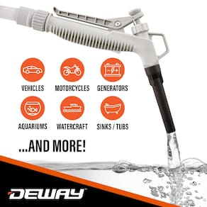 O sifão que gruda por você através de grosso e fino. Chega de se atrapalhar com latas de gás pesado! Deixe a bomba fazer o trabalho pesado com a coleção de bombas de transferência de bastão alimentadas por bateria DeWay. Com quatro bombas recentemente redesenhadas para transferir gasolina, querosene, combustível diesel, líquidos não corrosivos, água não potável, água suja de aquário e muito mais, esta linha potente e portátil oferece opções para operação conveniente com uma mão e completamente sem as mãos. Então, se você está procurando um sifão manual simples para abastecer carros e equipamentos de gramado ou uma bomba de 'definir e esquecer' com detecção automática de transbordamento, há um modelo construído para atender às suas necessidades específicas. Em vez de usar um painel de controle volumoso ou máquina externa para bombear, nosso motor altamente eficiente está alojado dentro de um bastão de sucção fino e estreito, o que significa que o tubo de admissão cabe dentro de quase qualquer lata de gás ou receptáculo similar! Cada bomba vem equipada com uma mangueira de descarga estendida de 129,5 cm (transparente, preta ou de borracha, dependendo do seu modelo), caixa de bateria de fácil acesso com capa protetora, clipe de armazenamento de mangueira sem gotejamento e simples interruptor liga/desliga. A coleção também apresenta quatro opções exclusivas de bicos para acomodar uma ampla variedade de usos, mas todas com a mesma impressionante taxa de transferência de 3,2 galões por minuto para a ação de sifonamento mais rápida e eficiente com baterias. Então, pare de colocar suas costas e corpo em posições perigosas — e fique com os especialistas em bombas portáteis! Adicione uma bomba de transferência a bateria DeWay ao seu carrinho hoje! - Bomba de combustível acionada por bateria | A bomba de transferência permite que você mova todos os tipos de líquidos não corrosivos e não potáveis sem derramamentos bagunçados e trabalho de quebra! O sistema fácil de usar possui uma mangueira de transferência transparente de 129 cm com bocal de gatilho operado com uma mão, tubo de admissão de 48 cm, interruptor de controle liga/desliga e operação conveniente de bateria [4 AA] para movimentação de gás, querosene, diesel, água suja, etc. - Transfere até 100 galões em pilhas 4AA | Não é necessário levantamento pesado! Desfrute de transferência de combustível de longa duração de até 3,2 galões por minuto ao operar em um plano horizontal | O motor interno altamente capaz da nossa bomba é ótimo para encher de forma rápida e eficiente, esteja você abastecendo carros, caminhões, cortadores de grama, tratores, geradores e embarcações; transferindo água do aquário; ou drenando o excesso de combustível para armazenamento sazonal - Controle o fluxo apenas como um posto de gasolina | O bocal manual de gatilho permite que você bombeie continuamente usando a aba de bloqueio integrada ou a bomba de líquido em jatos menores para trabalhos de transferência mais exigentes | Basta remover sua tampa de gás e inserir a bomba na lata, colocar o bico no tanque de recebimento, virar o interruptor "On", apertar o gatilho para iniciar o fluxo e liberar to Stop - MANGUEIRA EXTRA-LONGA COM DESIGN TRANSPARENTE | Enquanto as bombas de combustível dos concorrentes tendem a ficar curtas na distância, nossa mangueira de descarga de 129 cm de tamanho generoso garante maior flexibilidade, manobrabilidade e segurança para aplicações difíceis de alcançar | O design transparente do tubo permite que você observe o fluxo de gás, verifique se há líquido deixado para trás e identifique vazamentos ou problemas perigosos ms| Mangueira de substituição e Peças disponíveis para uso prolongado a longo prazo - Estilo universal de 'bastão' serve para a maioria das latas de gás | O design do tubo de admissão longo de 3,2 cm de largura, 48,3 cm e o design do bastão estreito a tornam amplamente compatível com as populares latas de gás especiais de 2,5 galões, 5 galões e maiores — não é necessário adaptador! Excelente escolha para transferências profissionais e pessoais de líquidos e combustíveis, como ciclomotores, scooters, quadriciclos, sopradores de neve, sopradores de folhas, enchimentos de beira de estrada, pias bloqueadas, banheiras e além!