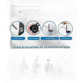 Bomba Elétrica Filtro Bebedouro Para Galão D'Água Recarregável Bomba de água dispensador automático elétrico portátil usb A bomba para galão de água elétrica recarregável é universal, que serve galões e garrafões de 5l, 10l, 20l e similare - bateria forte: dura até 8 galões de água de 20 litros. Carga: 3 horas - pode ser Utilizado quando estiver carregando - uso universal: serve todos os tamanhos de galões e garrafões, 5l, 10l, 20l e similares - materiais seguros: aço inox 304, plásticos pp, abs, eva , silicones, alumínio, bateria de li-ion, circuito eletrônico - tamanho pequeno - voltagem: bivolt 110v - 220v - ruído: baixo ruído Medidas: Altura: 13 cm Largura: 7 cm Canudo de sugação: 52,5 cm Bico : 10,5 cm Cabo carregador: 52 cm usb / mini usb não incluso a fonte somente cabo. Marca: Não Informado Ean: 7890185545891