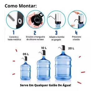 Bomba elétrica portátil para galões de água, com bateria recarregável via USB. Compatível com galões de 5, 10 e 20 litros. Duração aproximada de 7 galões por carga. Carregamento rápido em 3 horas.Compatível com
