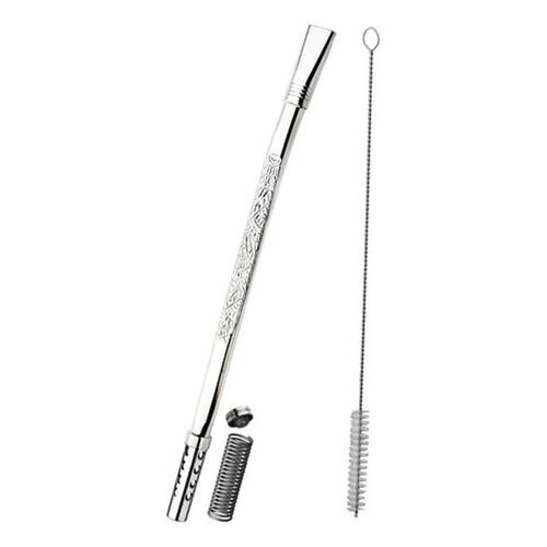 -cano trabalhado chato de 8 mm -bojo desmontável em forma de mola ajusta conforme o tipo de erva -acompanha uma escova para limpar o cano -comprimento 220 mm -chupeta dupla -toda em aço inoxidável