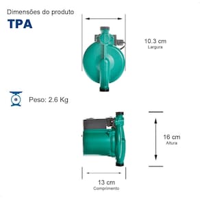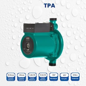 Sistema de Pressurização: Pressurização através de pressostatos e inversores de frequência. Ambiente Principal: Jardim e Varanda Composição: Carcaça de Ferro Fundido GG-20 com tratamento anti-ferrugem. Rotor em Termoplástico. Anel O'ring de vedação da carcaça e juntas em Buna N. Comprimento: 20 cm Consumo aproximado de energia: 0,13076 kW/h Diâmetro de Entrada: 0,75 in Diâmetro de Saída: 0,75 in Ergonômico: Não Indicado para: Residências, Indústrias, Comércios Itens Inclusos: Acompanha Itens Adicionais (1 Chave, 2 Adaptadores de Rosca e 2 Juntas de Vedação) Largura: 14 cm Manual de Montagem e Instalação: https://product-hub-prd.madeiramadeira.com.br/970844/documents/338e069e-9113-4fa6-8fa8-812e285bcfad2567661578317329065716203.pdf Marca: EBARA Material Principal: Ferro Modelo: Bomba Monoestágio Tpa 15-9-160 Monofásico Motor Thebe 120w 220v Necessita Montagem: Não Origem do Produto: Nacional Peso: 2,9 kg Possui Fluxostato: Sim Possui Protetor Térmico: Sim Potência do motor: 0,16 HP Recomendações de Uso, Manutenção e Limpeza: Verifique nosso manual de Manutenção Rolamento Blindado: Sim Temperatura Máxima da Água: 70 ° Tipo de Mecanismo: Não se Aplica Vazão Máxima de Água: 1,6 m³/hora Vazão Mínima de Água: 0,3 m³/hora Voltagem: 220V