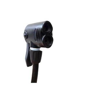 Bico: reversível presta e schrader. Barril: aço Estrutura externa: nylon Manômetro: manometro analógico Estrutura para apoio dos pés com mini reservatório Pressão de calibragem: 100 psi Tubo em 3 polegadas com 59 cm de altura.