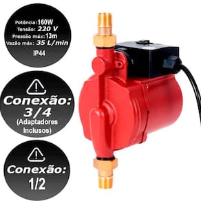 Especificações Técnicas: - Voltagem: 110V - Frequência: 60Hz - Potência: 160 watts - Sucção Máxima: 13m - Vazão Máxima: 2100 l/h - 35 l/min. - Possui chave seletora para ser desligado em caso de longa ausência da residência - Silencioso e compacto - Funcionamento manual ou automático por fluxostato - Construído em materias resistentes a corrosão - Motor resfriado a água - Comprimento do cabo: 1.10m - Tomada: 3 Pinos com Aterramento 10A - Dimensões: 17 cm x 9 cm x 15cm (AxLxC) - Peso: 2.80 Kg - Pressuriza água fria e água quente (até 80ºC / 176ºF) - Diâmetro de entrada e saída: 1/2 NPT - Pressão de entrada mínima: 0.72 PSI - Pressão de entrada máxima: 145 PSI - Condutores: 22 AWG x 3C com 221°F de temperatura de isolamento - Isolamento: Classe I - Grau IP: IP44