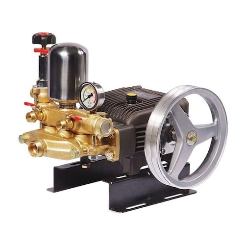 Bomba Agrícola PSP45C. Esta é uma bomba pulverizadora tríplex que possui uma pressão de trabalho variável entre 21 ~ 45 kgf/cm e seu fluxo de Água entre 30 ~ 45 Lpm. A PSP45C é indicada para pulverização agrícola em culturas em geral, podendo ainda ser utilizada como lavadoras de alta vazão em açougues, frigoríficos e etc. Esta Bomba Agrícola podem ser acionada por motores elétricos, a gasolina ou diesel. Seu eixo passante permite que ela seja montada com a polia em ambos os lados da bomba conforme a necessidade ou tipo de motor aplicado.