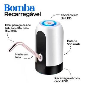 Bomba Recarregável Para Galão De Água Garrafão Elétrica Bomba Elétrica D'agua Pequeno e fácil manuseio, Ideal para galões de 1.5L / 5.7L / 10L / 11.3L / 15L / 18.9L / 20L. - Recarregável com cabo USB - Haste em Inox - Luz de LED ESPECIFICAÇÕES: -Dimensões: 13cm altura x 6cm largura -Material: tubo de aço, mangueira de silicone. -Cor: Branca e preta -Bateria: 500 mAh CONTÉM: 01 Bomba Recarregável Para Galão De Água Garrafão Elétrica