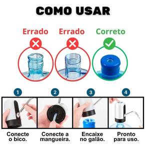 Prático e simples de beber água, podendo ser levado para qualquer lugar e ser utilizado em qualquer galão. Recarregável através de fontes de celular, bivolt.