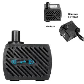 Principais Características: - Motor bomba submersa para aquário, fontes e bebedouros pet - Potência de 3W - Voltagem 220V - Frequência de 50/60Hz - Elevação máxima de 4cm - Vazão máxima de 180 l/h - Nível de proteção IP-X8 - Fácil instalação e manutenção - Design compacto e leve - Resistente à abrasão - Controle de vazão de água - Ventosas de alta resistência para fixação discreta - Material em plástico ABS e componentes eletrônicos