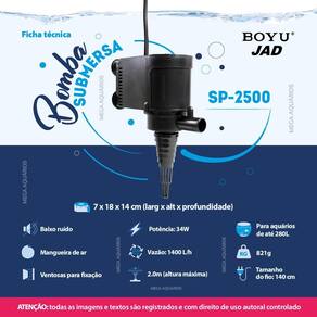 Bomba bombinha submersa jad boyu sp-2500 34w 1400l/h para aquário, cascatas pequenas e fontes de água Bombinha submersa blindada de baixo consumo de energia, design compacto, auxilia na oxigenação e na circulação da água. Preparada para ficar ligada constantemente. Ela é totalmente vedada, o que a torna segura para danos elétricos em contato com a água. Características: Um único equipamento com duas funções - bomba para circulação de água e oxigenador Bombinha submersa silenciosa e compacta Baixo consumo de energia Possui ventosas para fixação Acompanha mangueira de ar para auxílio na oxigenação Fácil instalação, limpeza e manutenção Resistente Durável Impeller de fácil Serve como peça de reposição para o filtro jad ou sp-2500ii sp-2500iii É possível encaixar até 3 refis de filtro esponja biológico modelo próprio Especificações técnicas: Marca: jad boyu a marca será enviada conforme disponibilidade Modelo: sp-2500 Potência: 34w Voltagem: escolha a voltagem no botão do anúncio Hmax: 2.0m altura máxima que a bomba consegue elevar a água Vazão: 1400l/h Indicado para aquários de até 280l Medidas: 7 x 18 x 14cm larg x alt x profundidade Peso: 821g Tamanho do fio: 140cm Marca jad / boyu As marcas jad e boyu pertencem ao mesmo fabricante, os produtos são exatamente iguais e chegam ao país por empresas diferentes, cada uma com um direito de uso de marca. Aplicação: Circulação de água em pequenos aquários Circulação de água em laguinhos Auxílio na oxigenação de água de pequenos lagos e aquários Elevar água do sump para aquário Direcionar água para sump Direcionar água para filtro tipo cânister Direcionar água para filtro uv ultravioleta Fontes de água com até 1,6m de altura Bebedouro grande para gatos Hidroponia Nota: 1 - nunca deixe a bomba ligada sem água em circulação, isso queimará a bomba em poucos minutos. 2 - a vazão da bomba indicada é referente a saída linear. Sempre que elevar para cima a água de uma bomba, sua vazão é reduzida levando em consideração os fatores: altura, diâmetro e curva da mangueira. Serve para fazer bolhas no aquário Não serve, o objetivo da bomba é de circulação de água. Para bolhas de ar é necessário um compressor de ar para aquário. Até quanto ela consegue elevar a água Cerca de 200 centímetros Obrigado pela visita e boas compras Atenção: nossas imagens e textos são registrados e com direitos de uso reservados a essa loja e as lojas parceiras devidamente autorizadas em contrato. Marca: Não Informado Ean: 7793299439820