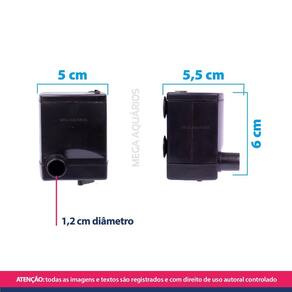 Bomba bombinha submersa SP-700 230L/h eleva a água a 60 cm para aquário, bebedouro de gatos e fontes de água Bombinha submersa blindada de baixo consumo de energia para circulação da água. Preparada para ficar ligada constantemente. Ela é totalmente vedada, o que a torna segura para danos elétricos em contato com a água. Características: Bombinha submersa silenciosa e compacta Baixo consumo de energia Controle de vazão Possui ventosas para fixação Fácil instalação, limpeza e manutenção Resistente Durável Especificações técnicas: Marca: Jad / Boyu enviada conforme disponibilidade em Modelo: SP-700 Potência: 5W Hmax: 60cm altura máxima que a bomba consegue elevar a água Vazão: 230L/h Indicado para aquários de até 45L Medidas: 5 x 6 x 5,5 cm larg x alt x profundidade Peso: 227g Tamanho do fio: 90cm Marca JAD / Boyu As marcas Jad e Boyu pertencem ao mesmo fabricante, os produtos são exatamente iguais e chegam ao país por empresas diferentes, cada uma com um direito de uso de marca. Aplicação: Circulação de água em aquários Fonte de água até 50cm de altura Bebedouro de gato Cascata até 50m de altura Hidroponia Nota: 1 - A vazão da bomba indicada é referente a saída linear. Sempre que elevar para cima a água de uma bomba, sua vazão é reduzida levando em consideração os fatores: altura, diâmetro e curva da mangueira. 2 - Para utilização em bebedor de água para gatos, certifique que a bomba fique coberta pela água constantemente. Caso a bomba fique ligada sem água ela queimará. Sempre reponha a água no recipiente. 3 - Nunca deixe a bomba ligada sem água em circulação. Serve para fazer bolhas no aquário Não serve, o objetivo da bomba é de circulação de água. Para bolhas de ar é necessário um compressor de ar para aquário. Obrigado pela visita e boas compras ATENÇÃO: Nossas imagens e textos são registrados e com direitos de uso reservados a essa loja e as lojas parceiras devidamente autorizadas em contrato. Especificações técnicas: Marca: Jad / Boyu enviada conforme disponibilidade em Modelo: SP-700 Potência: 5W Voltagem: 110v Hmax: 60cm altura máxima que a bomba consegue elevar a água Vazão: 230L/h Indicado para aquários de até 45L Medidas: 5 x 6 x 5,5 cm larg x alt x profundidade Peso: 227g Tamanho do fio: 90cm Marca JAD / Boyu As marcas Jad e Boyu pertencem ao mesmo fabricante, os produtos são exatamente iguais e chegam ao país por empresas diferentes, cada uma com um direito de uso de marca. Aplicação: Circulação de água em aquários Fonte de água até 50cm de altura Bebedouro de gato Cascata até 50m de altura Hidroponia Nota: 1 - A vazão da bomba indicada é referente a saída linear. Sempre que elevar para cima a água de uma bomba, sua vazão é reduzida levando em consideração os fatores: altura, diâmetro e curva da mangueira. 2 - Para utilização em bebedor de água para gatos, certifique que a bomba fique coberta pela água constantemente. Caso a bomba fique ligada sem água ela queimará. Sempre reponha a água no recipiente. 3 - Nunca deixe a bomba ligada sem água em circulação. Serve para fazer bolhas no aquário Não serve, o objetivo da bomba é de circulação de água. Para bolhas de ar é necessário um compressor de ar para aquário. Obrigado pela visita e boas compras ATENÇÃO: Nossas imagens e textos são registrados e com direitos de uso reservados a essa loja e as lojas parceiras devidamente autorizadas em contrato.