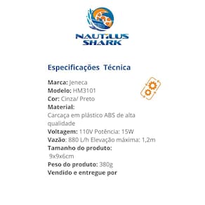 Antes de utilizar, deve-se verificar se a tensão especificada impressa na placa coincide com a tensão real. Quando houver necessidade de manusear a bomba, desconecte-a sempre da tomada elétrica. Não opere a bomba a seco/acima do nível da água ? Não manuseie a bomba levantando-a com o cabo de alimentação. Esta bomba pode ser imersa na água a uma profundidade máxima de 90cm. Para a limpeza da bomba, remova a tampa frontal e o impulsor. Qualquer resíduo preso pode ser removido com uma pequena escova de limpeza ou jato forte de água. Marca: Jeneca Modelo: HM3101 Cor: Cinza/ Preto Material: Carcaça em plástico ABS de alta qualidade Voltagem: 220V Potência: 15W Vazão: 880 L/h Elevação máxima: 1,2m Tamanho do produto: Carcaça: 9x9x6cm Peso do produto: 380g Vendido e entregue por Nautilus Aquarismo