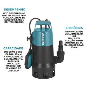 Bomba submersível makita linha aquamak pf1010 com 1.100w Bomba para água suja e contaminada. Ideal para drenagem de água suja, água contaminada pesada esgoto . Alto desempenho, uso em bacias pluviais, galerias de esgoto e lagos contaminados. Benefícios para o usuário Bombas submersíveis com corpo de plástico. Para águas muito sujas. Bomba de água submersível profissional para águas sujas ou muito sujas com máx. Diâmetro de 35 milímetros de partículas. Ideal para o esvaziamento de barris, jardins lagos ... Corpo da bomba em plástico rígido. Dupla junta com óleo que garante uma longa duração da vida útil do motor. automático de nível. Ele pode ser configurado para ligar ou desligar, dependendo do nível da água. Cômodo transporte, graças a sua cômoda asa superior para uma perfeita fixação. Vortex: electrobomba submersível transportável, para águas gordurosas com partes em suspensão. Também pode utilizar-se como bomba de emergência em caso de inundações onde a água está cheia de lodo, Graças as amplas aberturas da grelha de aspiração. Dados técnicos: Potência: 1.100w; Diâmetro de saída: 11/2 38,1 mm ; Succção e descarga: 30mm; Capacidade de bombeamento: 240l/min; Recalque máximo: 10m; Profundidade de submersão: 5m; Min. Nível sucção: 40mm; Comprimento do cabo: 10m; Entrada de tamanho de grão: 35mm; Dimensões c x l x a : 160 x 168 x 380mm; Peso: 6.6kg. Itens que acompanham a máquina: Bocal de conexão da bomba de 1-1/4. Para mangueira interna de 20 mm/30 mm ou rosca macho de 1. Marca: Não Informado