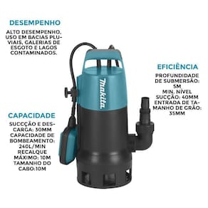 Bomba submersível makita linha aquamak pf1010 com 1.100w Bomba para água suja e contaminada. Ideal para drenagem de água suja, água contaminada pesada esgoto . Alto desempenho, uso em bacias pluviais, galerias de esgoto e lagos contaminados. Benefícios para o usuário Bombas submersíveis com corpo de plástico. Para águas muito sujas. Bomba de água submersível profissional para águas sujas ou muito sujas com máx. Diâmetro de 35 milímetros de partículas. Ideal para o esvaziamento de barris, jardins lagos ... Corpo da bomba em plástico rígido. Dupla junta com óleo que garante uma longa duração da vida útil do motor. automático de nível. Ele pode ser configurado para ligar ou desligar, dependendo do nível da água. Cômodo transporte, graças a sua cômoda asa superior para uma perfeita fixação. Vortex: electrobomba submersível transportável, para águas gordurosas com partes em suspensão. Também pode utilizar-se como bomba de emergência em caso de inundações onde a água está cheia de lodo, Graças as amplas aberturas da grelha de aspiração. Dados técnicos: Potência: 1.100w; Diâmetro de saída: 11/2 38,1 mm ; Succção e descarga: 30mm; Capacidade de bombeamento: 240l/min; Recalque máximo: 10m; Profundidade de submersão: 5m; Min. Nível sucção: 40mm; Comprimento do cabo: 10m; Entrada de tamanho de grão: 35mm; Dimensões c x l x a : 160 x 168 x 380mm; Peso: 6.6kg. Itens que acompanham a máquina: Bocal de conexão da bomba de 1-1/4. Para mangueira interna de 20 mm/30 mm ou rosca macho de 1. Marca: Não Informado Ean: 7909463122911