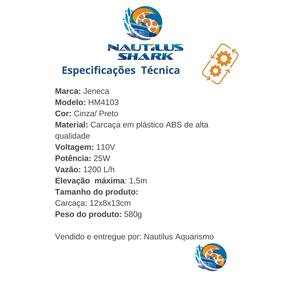 Marca: Jeneca Modelo: HM4103 Cor: Cinza/ Preto Material: Carcaça em plástico ABS de alta qualidade Voltagem: 110V Potência: 25W Vazão: 1200 L/h Elevação máxima: 1,5m Tamanho do produto: Carcaça: 12x8x13cm Peso do produto: 580g