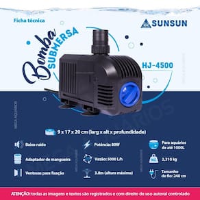 Especificações técnicas: Marca: Sunsun Modelo: HJ-4500 Potência: 80W Hmax: 3.8m altura máxima que a bomba consegue elevar a água Vazão: 5000 L/h Voltagem: escolha a voltagem no botão do anúncio Indicado para aquários e lagos de até 1000L Medidas: 9 x 17 x 20cm larg x alt x profundidade Peso: 2,310kg Tamanho do fio: 240cm