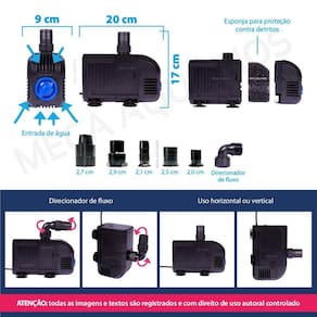Aplicação: Circulação de água em aquários Circulação de água em lagos / laguinhos Elevar água do sump para aquário Direcionar água para sump Direcionar água para filtro tipo cânister ou filtro UV ultravioleta Fontes de água / chafariz / cascata com até 2,8m de altura Hidroponia