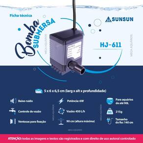 Especificações técnicas: Marca: Sunsun Modelo: HJ-611 Potência: 6W Hmax: 90cm altura máxima que a bomba consegue elevar a água Vazão: 450L/h Voltagem: Escolha a voltagem 110v ou 220v no botão do anúncio Indicado para aquários de até 90L Medidas: 5 x 6 x 6,5cm larg x alt x profundidade Peso: 215g Tamanho do fio: 140cm