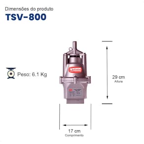 Residencial: Abastecimento de Reservatórios/caixas d'água, cisternas, pressurização de jardins. Acompanha bóia elétrica: Não Acompanha válvula de retenção: Não Altura: 29 cm Altura manométrica total: 70 mca Ambiente Principal: Jardim e Varanda Composição: Acompanha 3 metros de cabo e Kit de Instalação (3 abraçadeiras e curva suporte). Diâmetro de 165mm. Carcaça em alumínio. Parafusos de fixação em aço inox (não enferrujam). Comprimento: 17 cm Conexão de entrada/saída: Bocal de Recalque para mangueira de 1" Ergonômico: Não Funcionamento: Elétrica Itens Inclusos: Bomba Submersa Vibratória Tsv-800 127v Largura: 17 cm Manual de Montagem e Instalação: https://product-hub-prd.madeiramadeira.com.br/958316/documents/c402b1ba-3666-44cc-ab81-073ed967e4eb24173355783172789206519.pdf Material Principal: Alumínio Modelo: BOMBA SUBMERSA VIBRATÓRIA TSV-800 1/2 cv MONOFÁSICO MOTOR THEBE IP68 127V Necessita Montagem: Não Origem do Produto: Nacional Peso: 6,1 kg Potência do motor: 0,5 HP Profundidade de sucção: 70 m Recomendações de Uso, Manutenção e Limpeza: Verifique nosso Manual de Manutenção Temperatura Máxima da Água: 35 °C Tipo de bomba de água: Submersível Vazão máxima: 1.700 L/h Voltagem: 110V